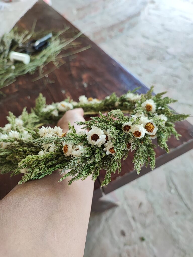 I u mom vrtu nježni klasovi prvih travki svake godine me izazivaju. Mnogi ih vrtlari smatraju nepoželjnim korovom, a ja sam i sad nabrala podeblji svežanj trave. Upletene sa prirodnim suhim cvijećem, vjenčiće čine lepšavijim i veselijim. Za svoj gušt sam isplela ovaj travanjski vjenčić sa suhim tratinčicama, cvjetnu krunu za kraljicu travnja. Potrajat će mi cijelo ljeto, a možda i dulje.