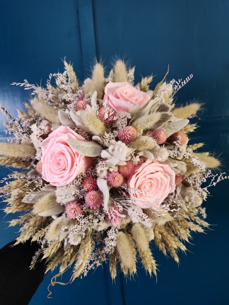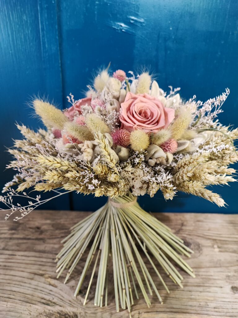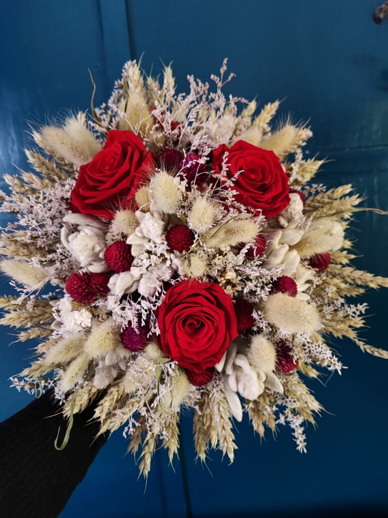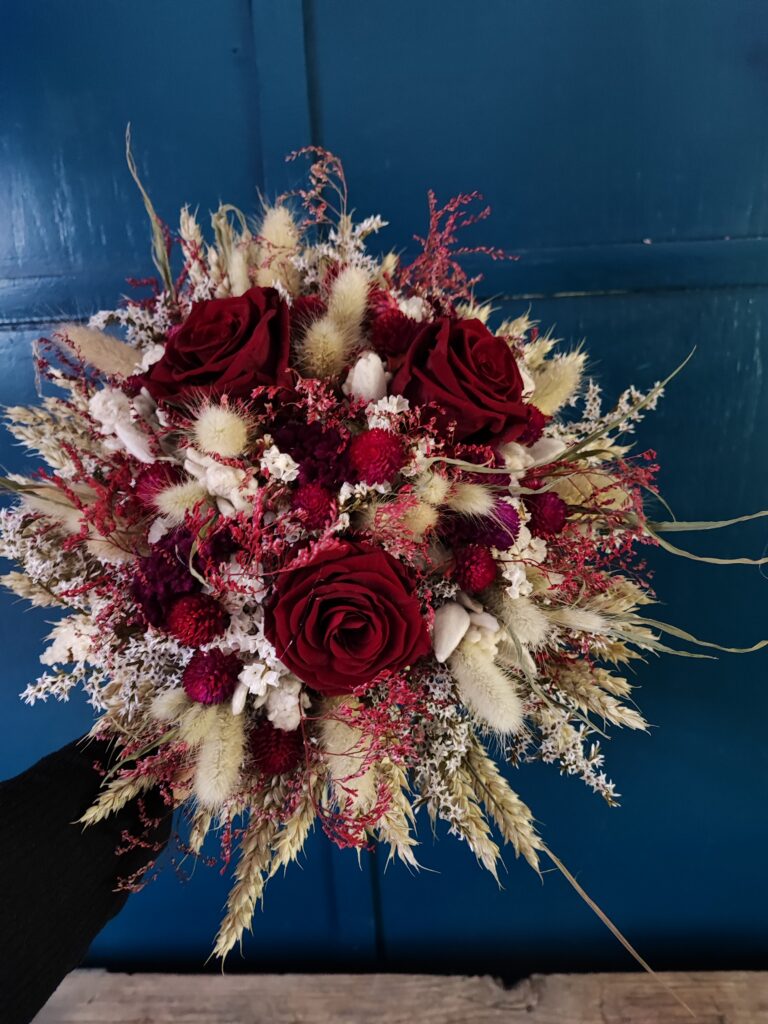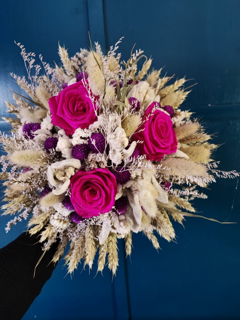 Samostojeći buket izrađen od pravih dehidriranih ruža i raznovrsnog prirodnog suhog cvijeća iz vlastitog vrta. Odabrana boja dehidrirane ruže određuje konačan izgled. Kod aranžiranja nastojim uskladiti boje i teksture cvijeća, trava i ostalih materijala kako bi buket bio upečatljiv i dostojan prigode kojoj je namijenjen. Svaki buket je unikat, stoga su moguća manja odstupanja u odnosu na fotografiju (nijansa, veličina 2cm+/-, izbor dostupnog materijala). Za izbor više boja dehidriranih ruža molim da me kontaktirate prije naručivanja ovdje.