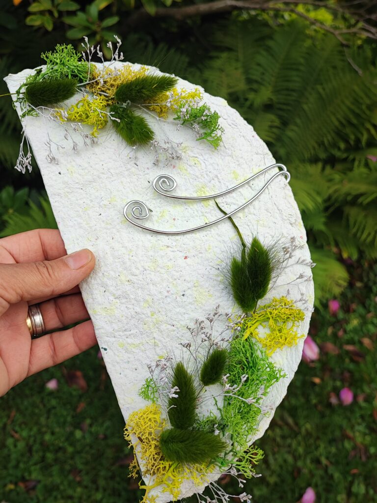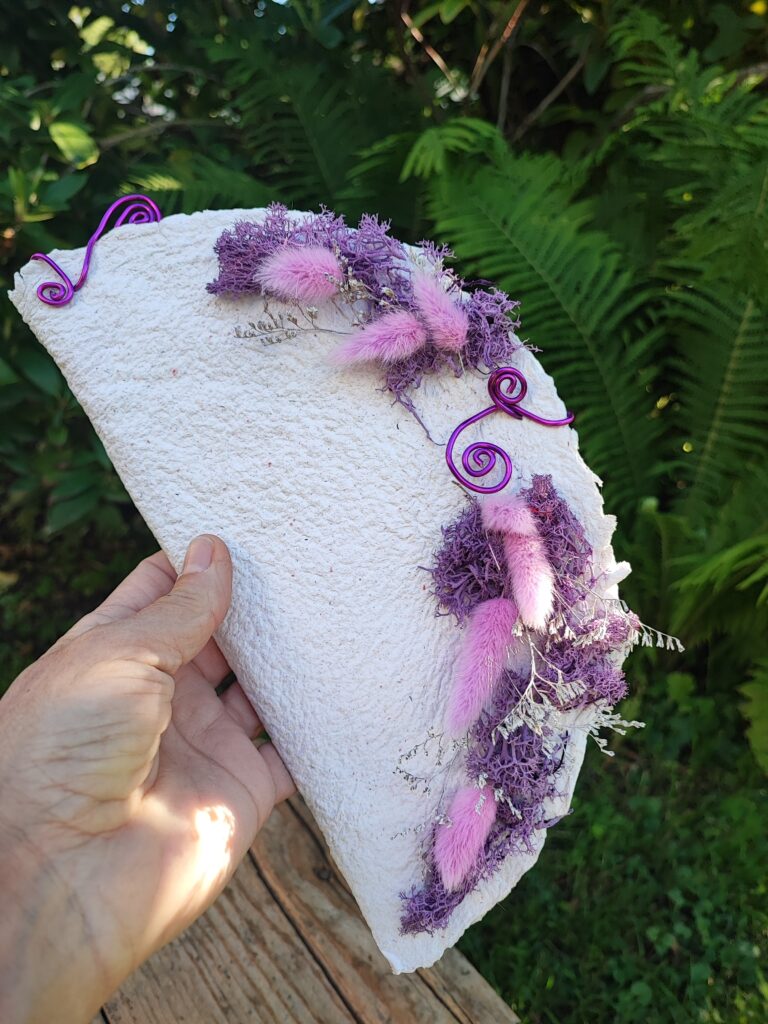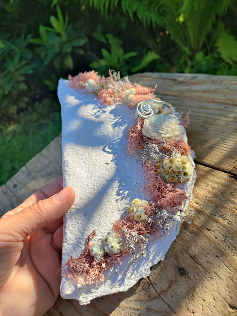 Ručno izrađena koverta od ručno izrađenog papira dekorirana kolažem od suhog cvijeća. Uz svaku dolazi prazna čestitka na koju možete upisati tekst po želji i klipsa od žice koja osigurava sadržaj od ispadanja.