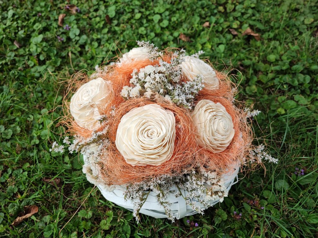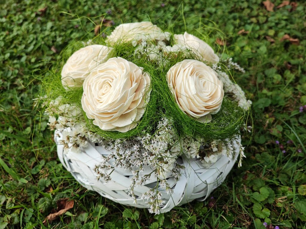 Aranžman od prirodnog suhog cvijeća i pet bijelih shola-ruža savršeno pristaje u bijelu košaricu. Dimenzije približno 25×20 cm