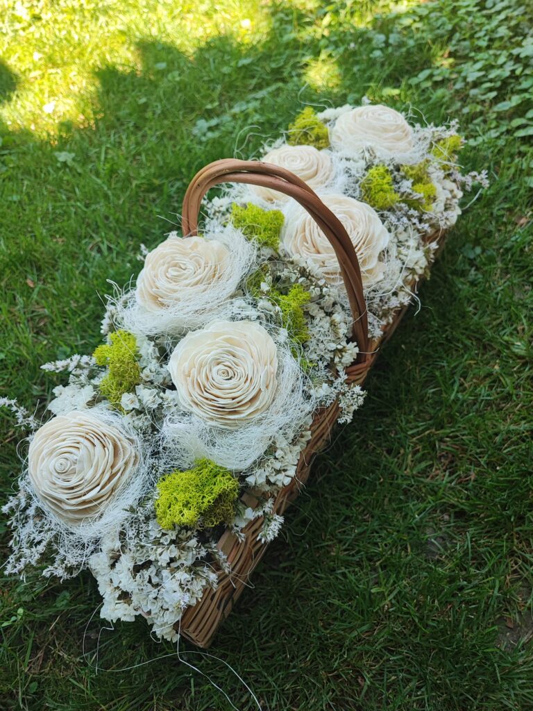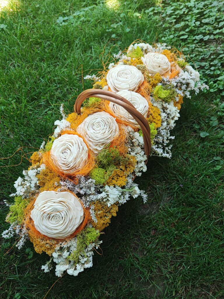 Raskošne dugoljaste ljetne košarice pune prirodnog suhog cvijeća s decentnim naglaskom boje. Trajna dekoracija za komodu ili stol. Dimenzije približno 50×15×25 cm.