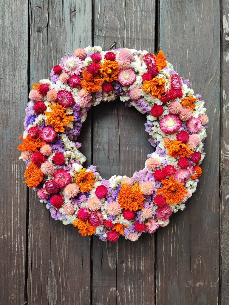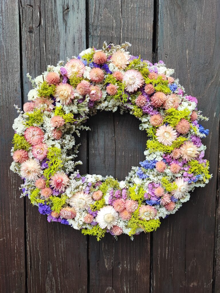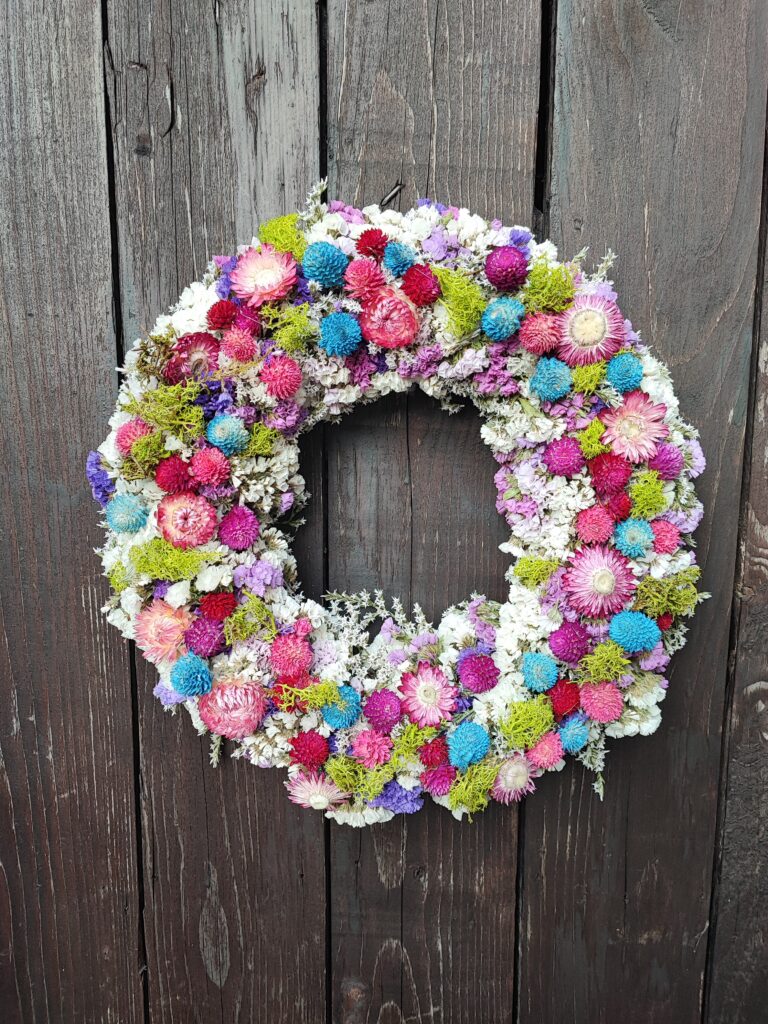 Šareni ljetni vjenčić od prirodnog suhog cvijeća iz Pušlekovog vrta izrađujem po narudžbi. Odabir boja i kombinacija boja cvijeća, fotke gotovog rada i druge detalje narudžbe dogovaramo u porukama. Vjenčić je ručni rad, moguća su odstupanja nijansi boja u odnosu na fotografije. Promjer vjenčića je približno 30 cm, moguće odstupanje +/- 2 cm