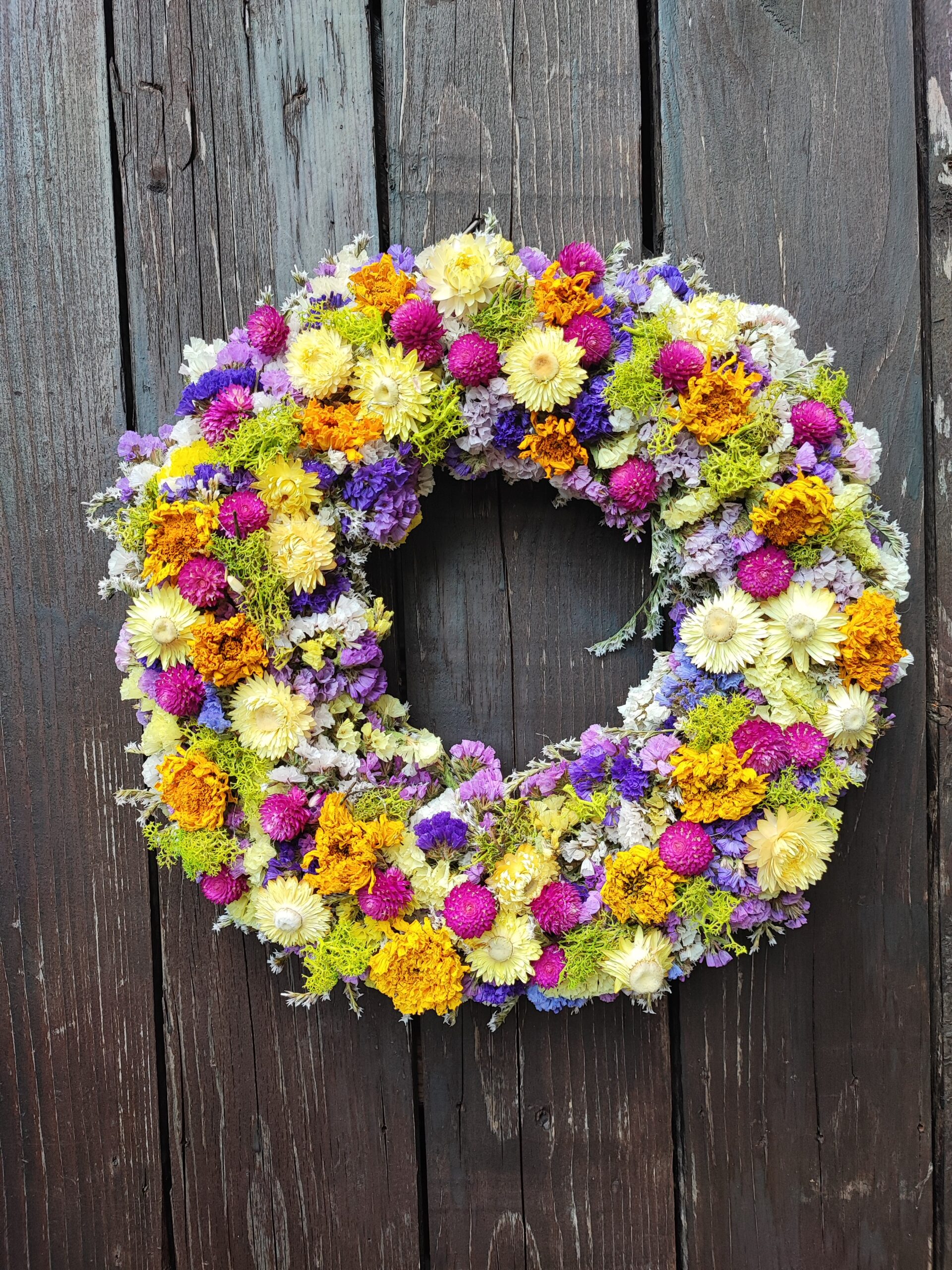 Šareni ljetni vjenčić od prirodnog suhog cvijeća iz Pušlekovog vrta izrađujem po narudžbi. Odabir boja i kombinacija boja cvijeća, fotke gotovog rada i druge detalje narudžbe dogovaramo u porukama. Vjenčić je ručni rad, moguća su odstupanja nijansi boja u odnosu na fotografije. Promjer vjenčića je približno 30 cm, moguće odstupanje +/- 2 cm